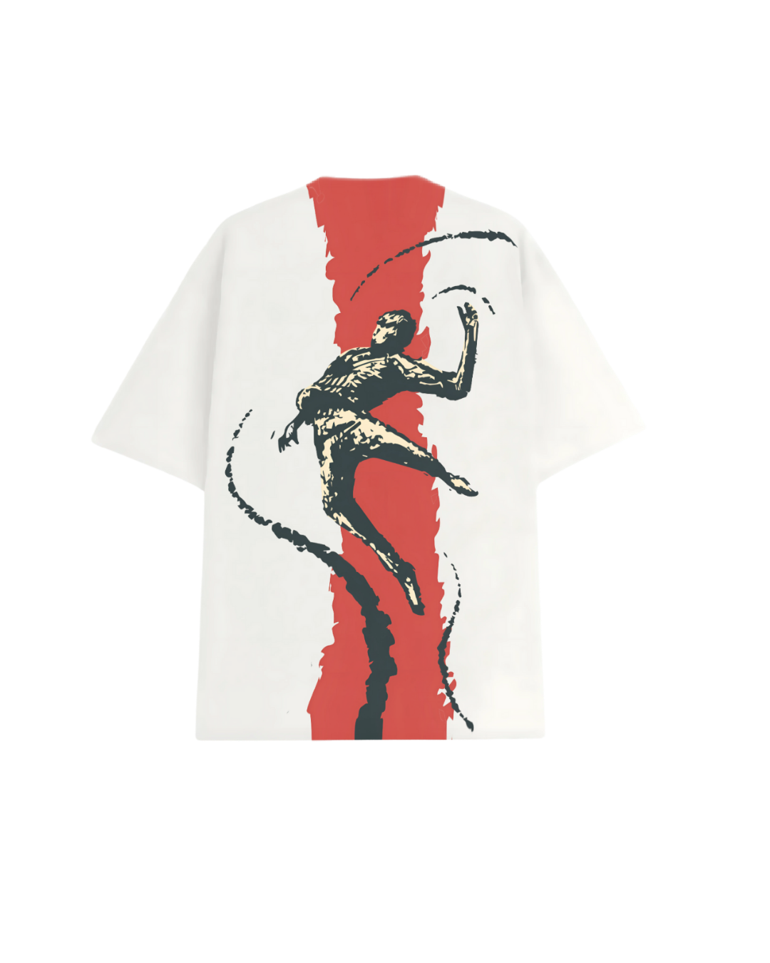 Break through space and perception with the Fly in Dimension tee – a visual homage to movement, freedom, and surreal expression. Featuring a striking abstract figure soaring mid-motion across a bold red vertical slash, this oversized white T-shirt captures the essence of rebellion and elevation.